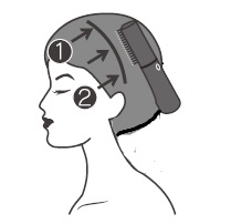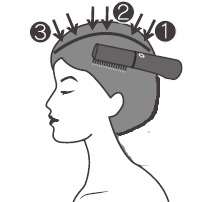 (1)頭頂部のつむじ周りに当てて、デンキバリブラシの強さを確認したら頭頂部からあてる
